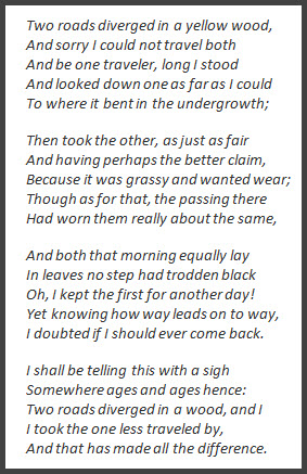 I dedicate this Robert Frost poem to all of you who, like myself, prefer to take the path less traveled.