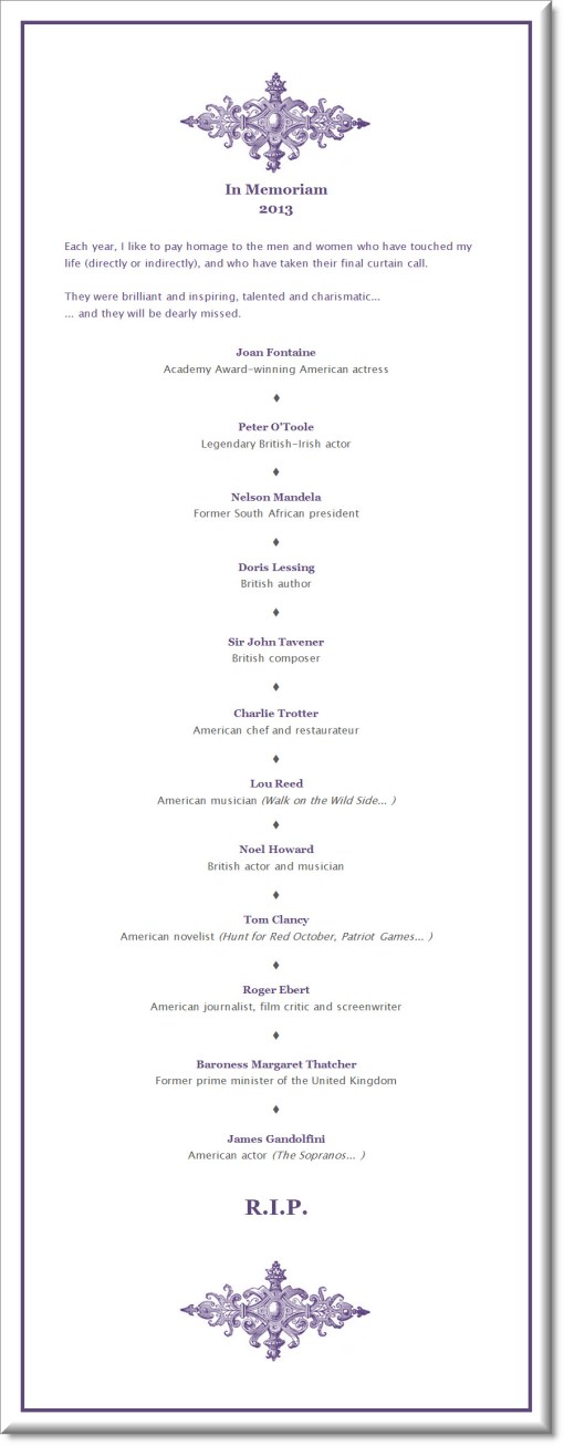 As 2013 draws to a close, I compiled this roster of my favorite iconic figures who have passed away this year.  In life, they graced us with their genius and charm. They leave behind a legacy in film, music and literary accomplishments, on stage, and as inspirational political leaders and activists.